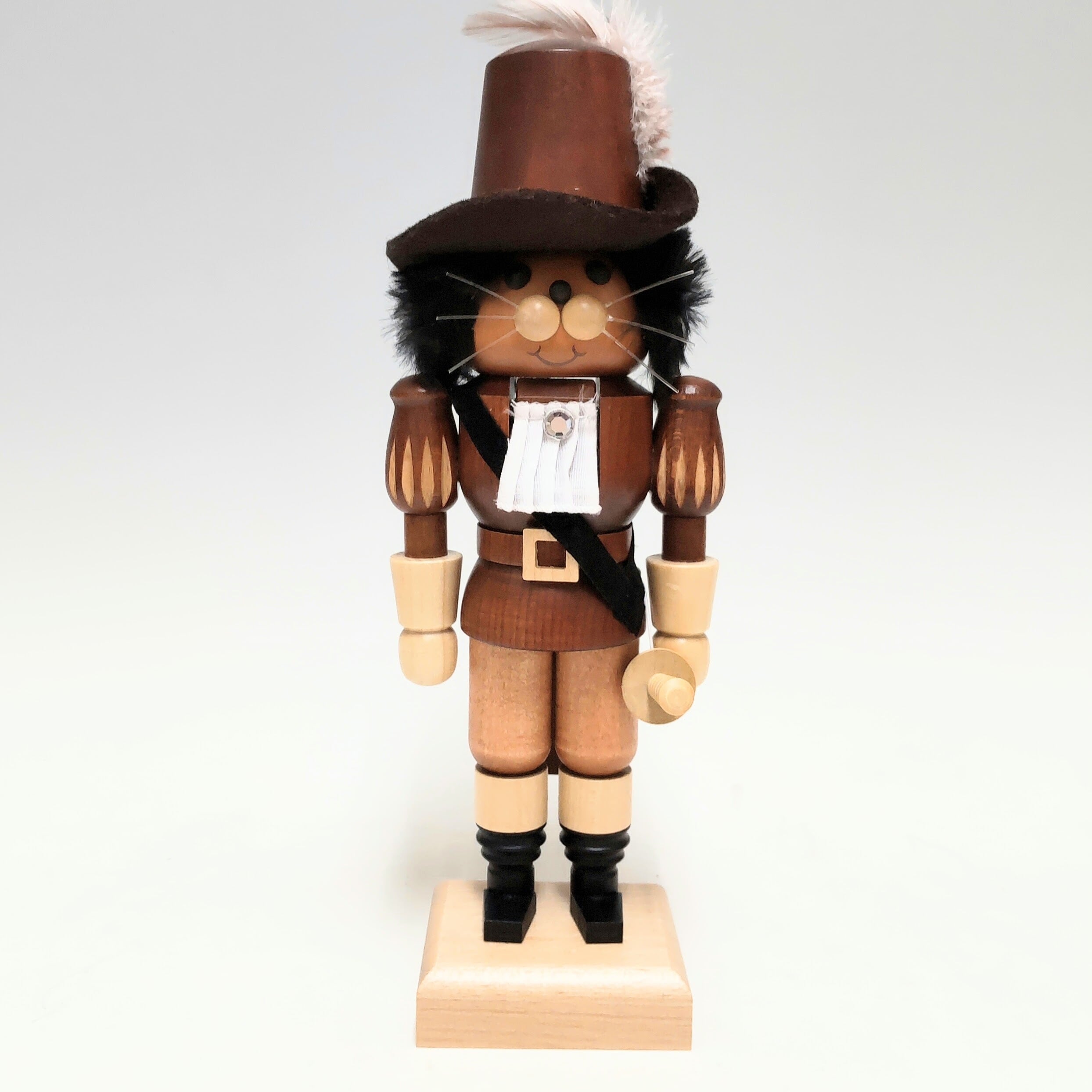 くるみ割り人形はドイツで生まれ、本来くるみや木の実を割るために作られ使用されましたが、だんだんデザインが豊富になり今では装飾品として愛されています。ご自分用にはもちろんのこと、大切なかたへの素敵なプレゼントをお探しの場合にも最適です。 このウルブリヒト社制作の「長靴を履いた猫小」は皆様よくご存じの世界的に有名な童話をテーマにした特別なモデルです。勇敢で、賢くて、やさしくて、とってもご主人思いの可愛く素敵な猫です。こんなお人形がそばにいたら、きっとワクワクされるのではないでしょうか。お顔も上品で可愛らしく、黒色の丸い目がとてもチャーミングで、冒険心もかんじられます。もちろん猫好きの方には、おすすめです。