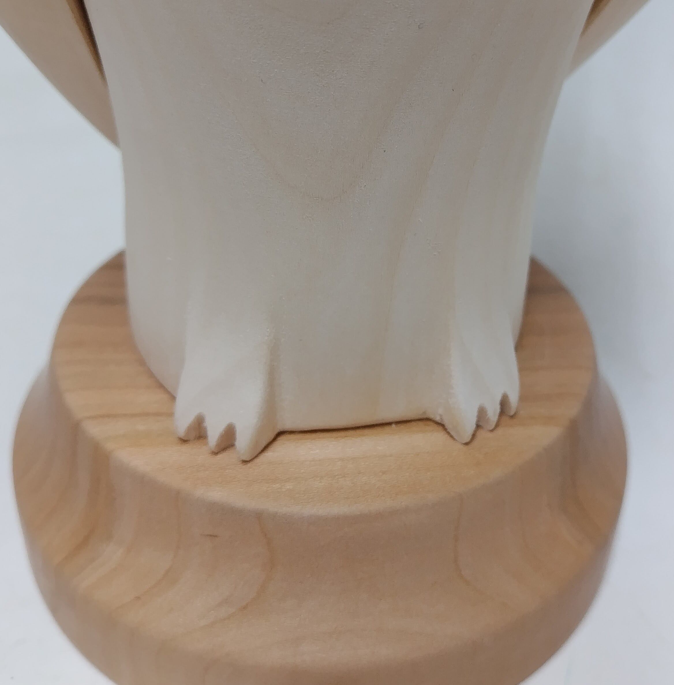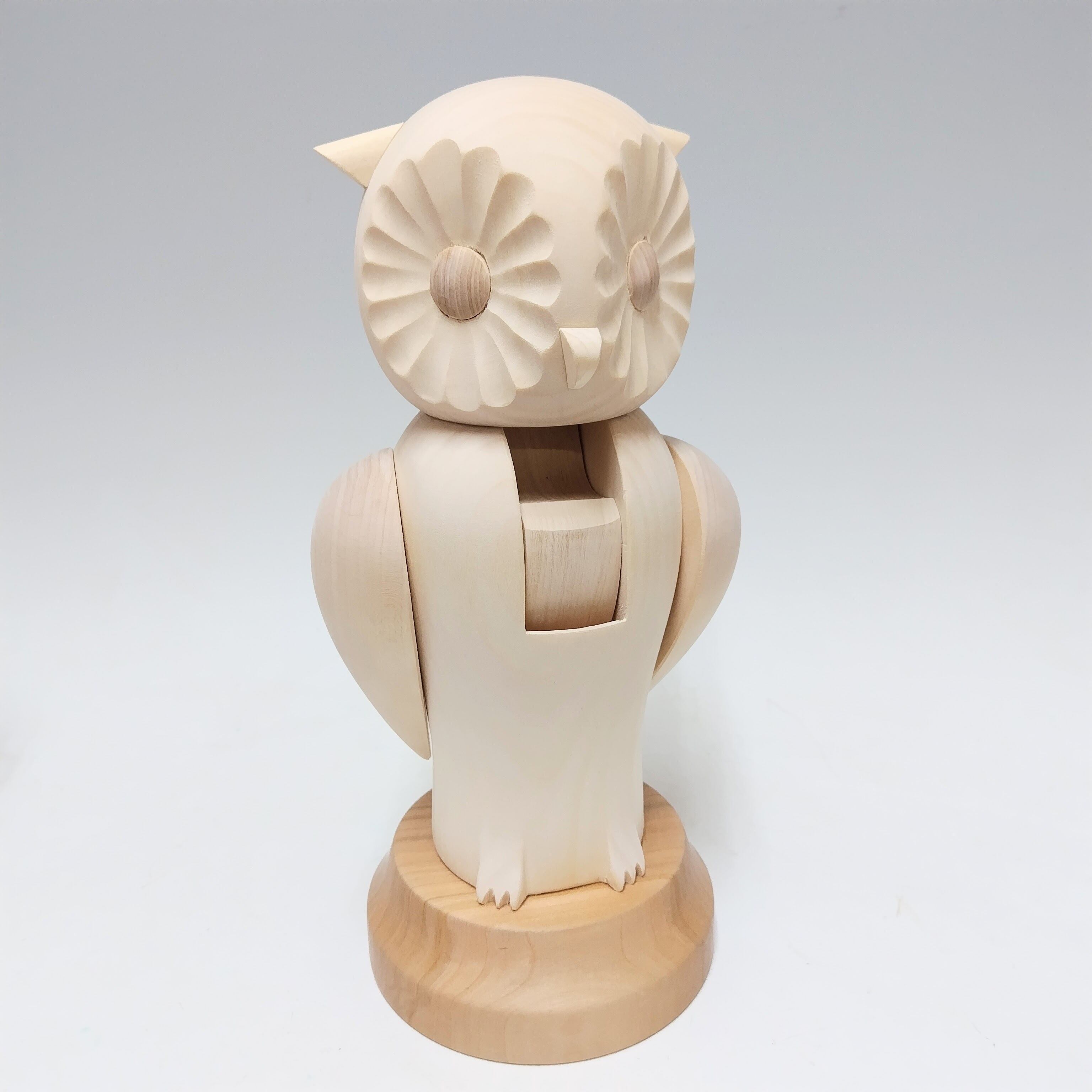 森の賢者ともいわれ知恵の象徴であるフクロウが優雅にたたずむ姿を見事に表現しています。特に彩色もニスも塗らない無垢材の美しさが非常に際立ち、柔らかな木肌がとても気持ちよく感じることができます。