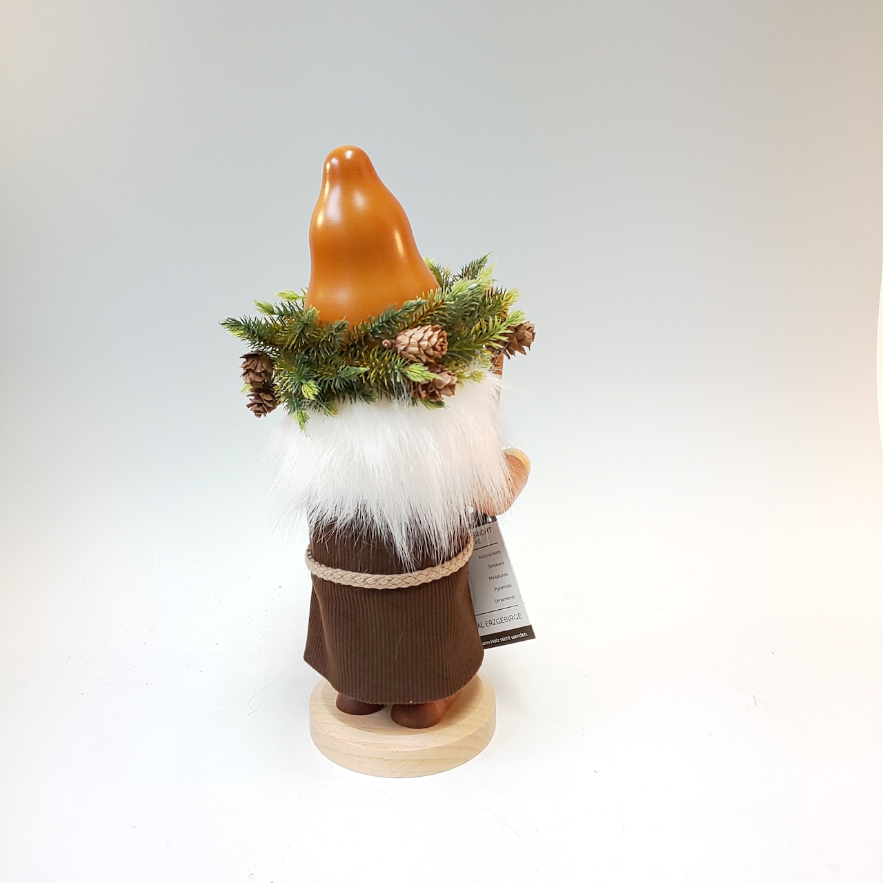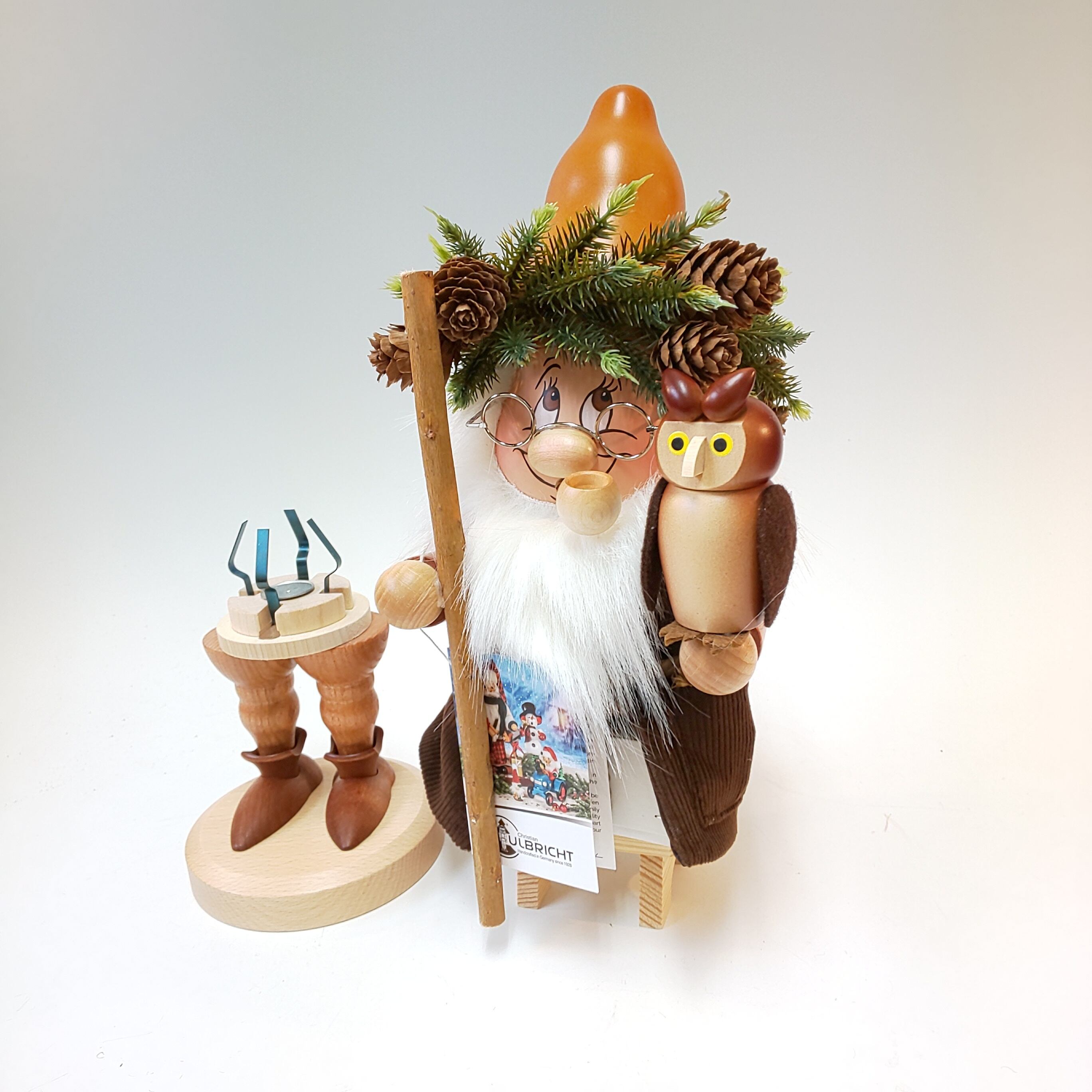 このお人形は香炉人形と言われ、胴体と脚の部分が二つに分かれ、脚の中にある金属の部分に香を載せ、火をつけて再び胴体を元通りにかぶせれば、口から煙がたなびき出ます。まるで人形が香炉のように見える大変ユニークな人形です。 穏やかで優しそうな森の精と賢そうなフクロウの取り合わせが素敵です。森の中に住んで森の仲間を見守っているようです。帽子には松ぼっくりが飾られた、素敵な装いです。森の中でばったり出会ったらきっと楽しいでしょうね。