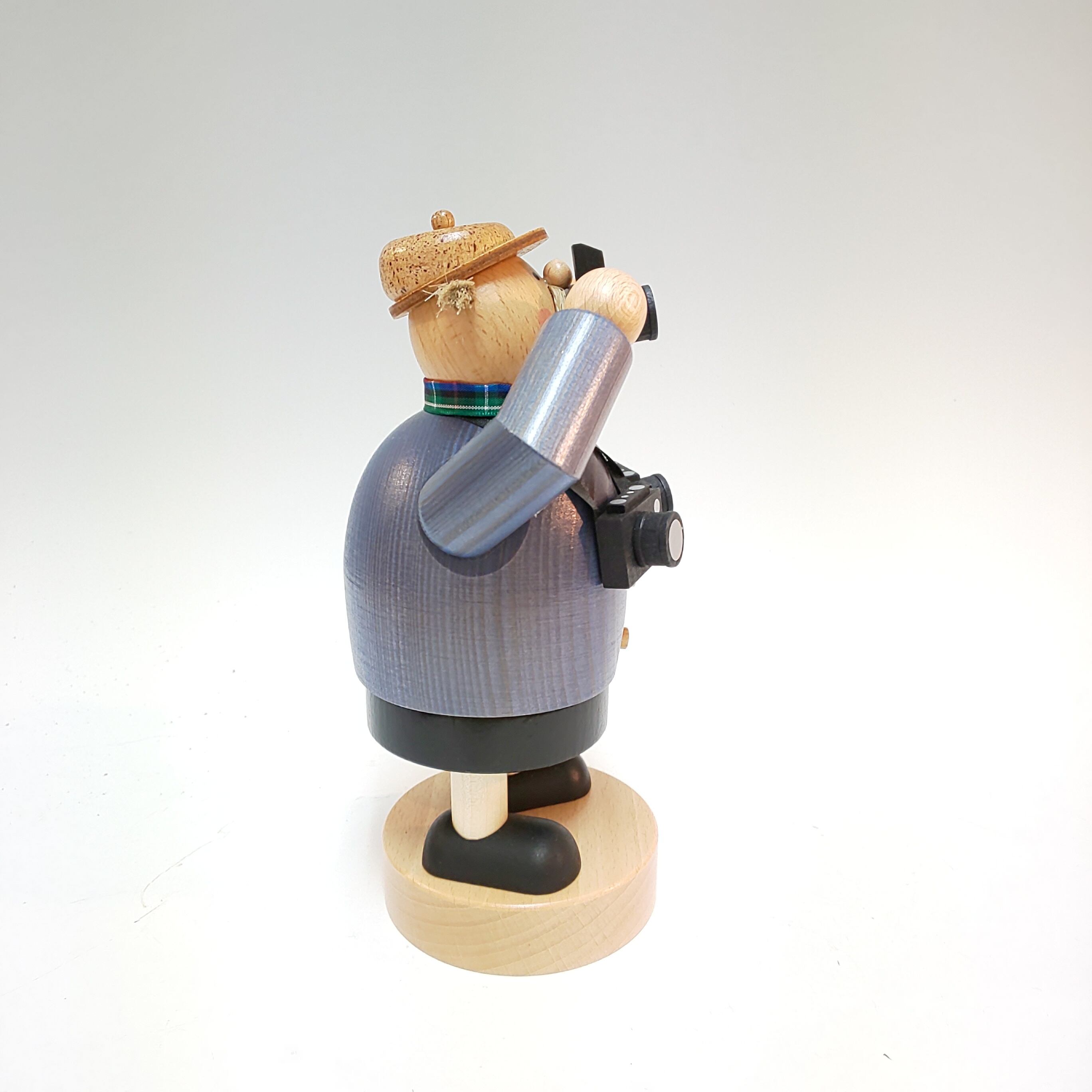 このお人形は香炉人形と言われ、胴体と脚の部分が二つに分かれ、脚の中にある金属の部分に香を載せ、火をつけて再び胴体を元通りにかぶせれば、口から煙がたなびき出ます。まるで人形が香炉のように見える大変ユニークな人形です。 カメラを構え、今にもパチリという瞬間です。ポケットには地図が差し込んであり、一見観光客のようですが、三台ものカメラを使い分けるのですから、多分写真家のようですね。絶景スポットを求めて次々とフィルムに収めているようです。落ち着いた紺色の上着にポケットのきれいな色合いの地図がよいアクセントになっています。