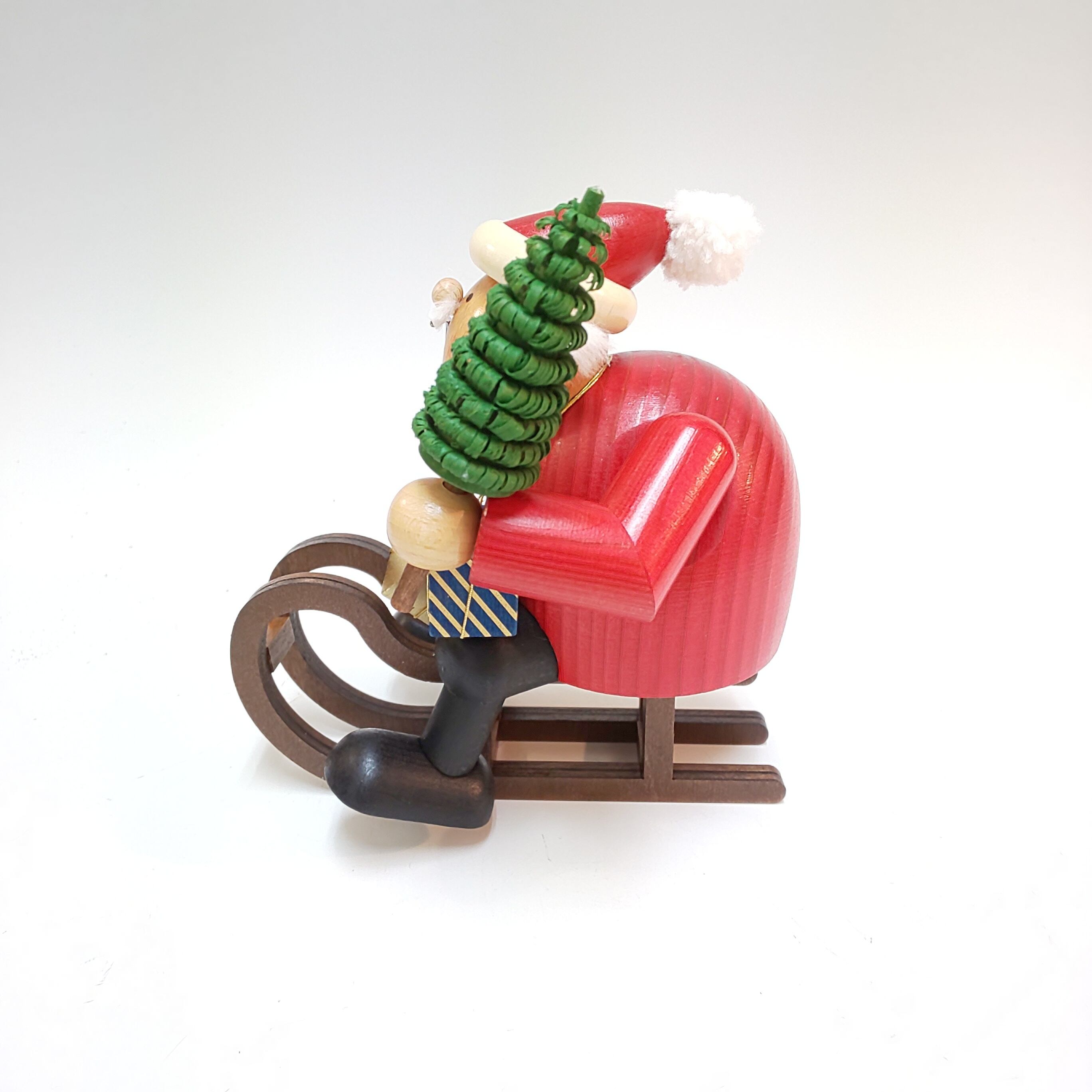 このお人形は香炉人形と言われ、胴体と脚の部分が二つに分かれ、脚の中にある金属の部分に香を載せ、火をつけて再び胴体を元通りにかぶせれば、口から煙がたなびき出ます。まるで人形が香炉のように見える大変ユニークな人形です。 ツリーを片手に首からはプレゼントを下げ、ソリで急いでやってくるサンタさんです。丸い身体と優しそうな表情で思わず笑顔になりそうです。美しい木目も素敵です。みんなが心待ちにしていますよ。