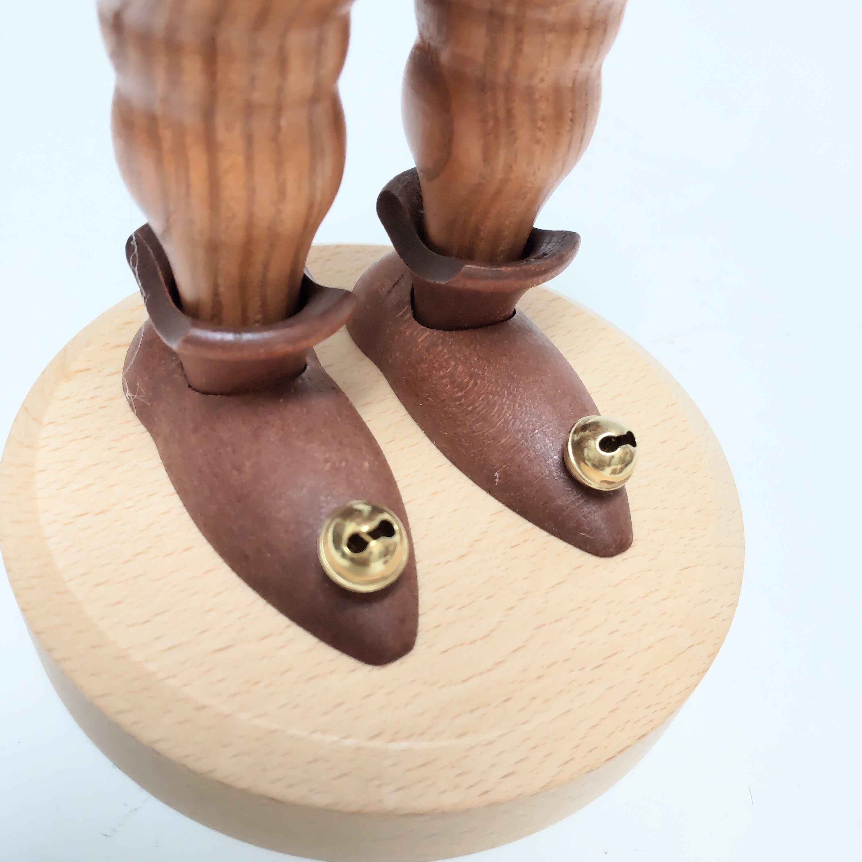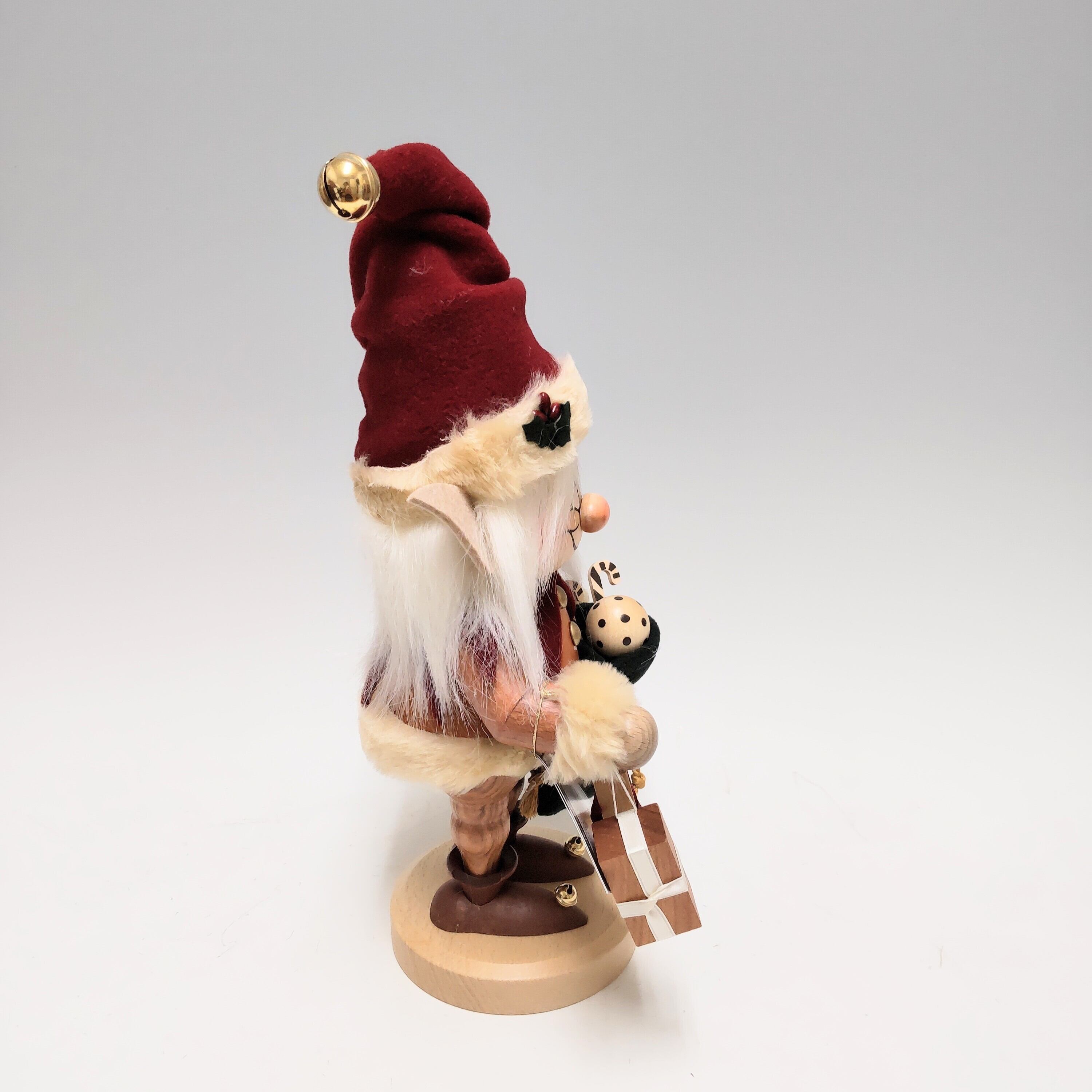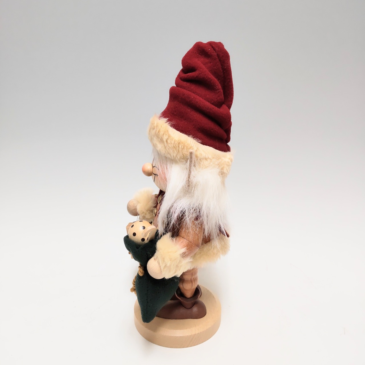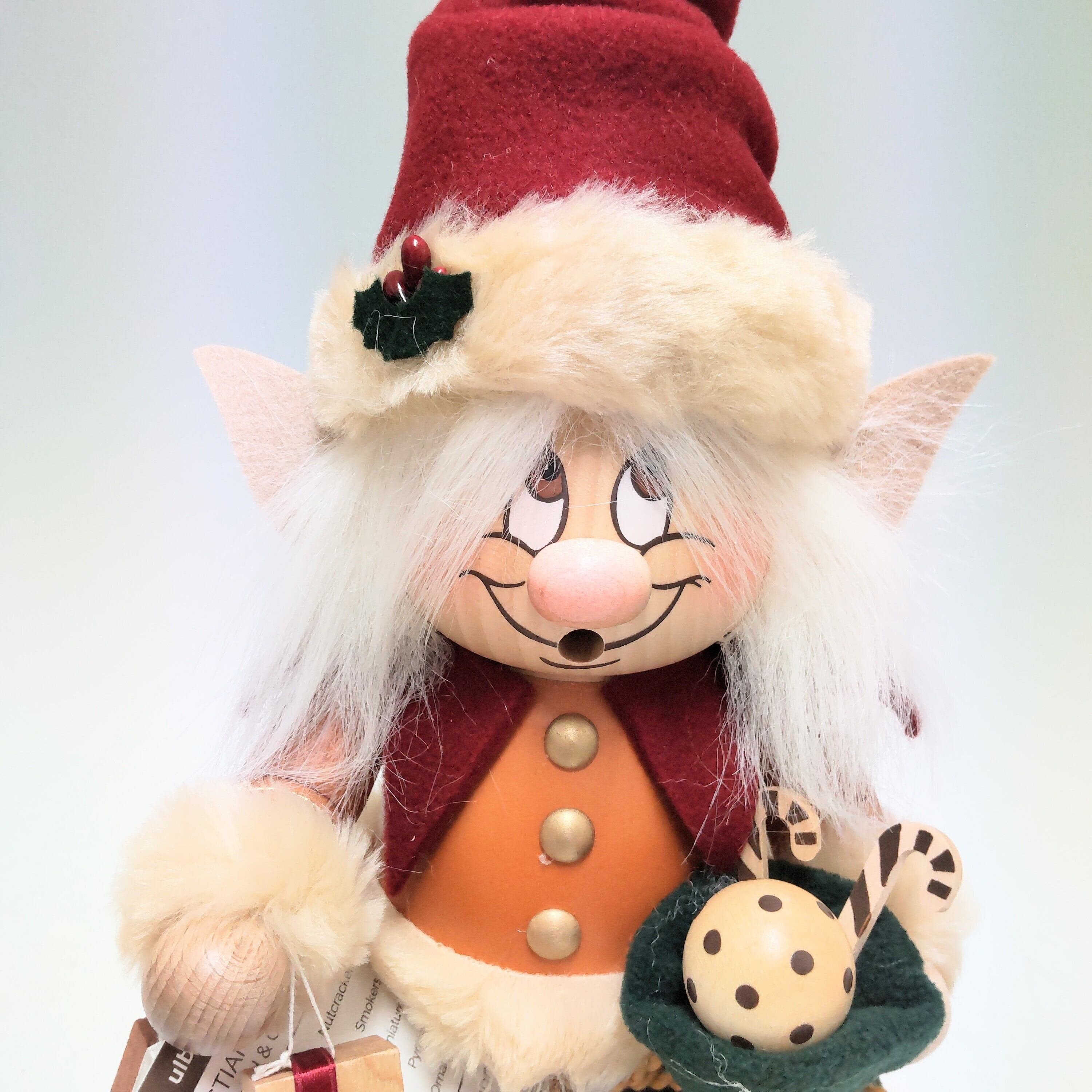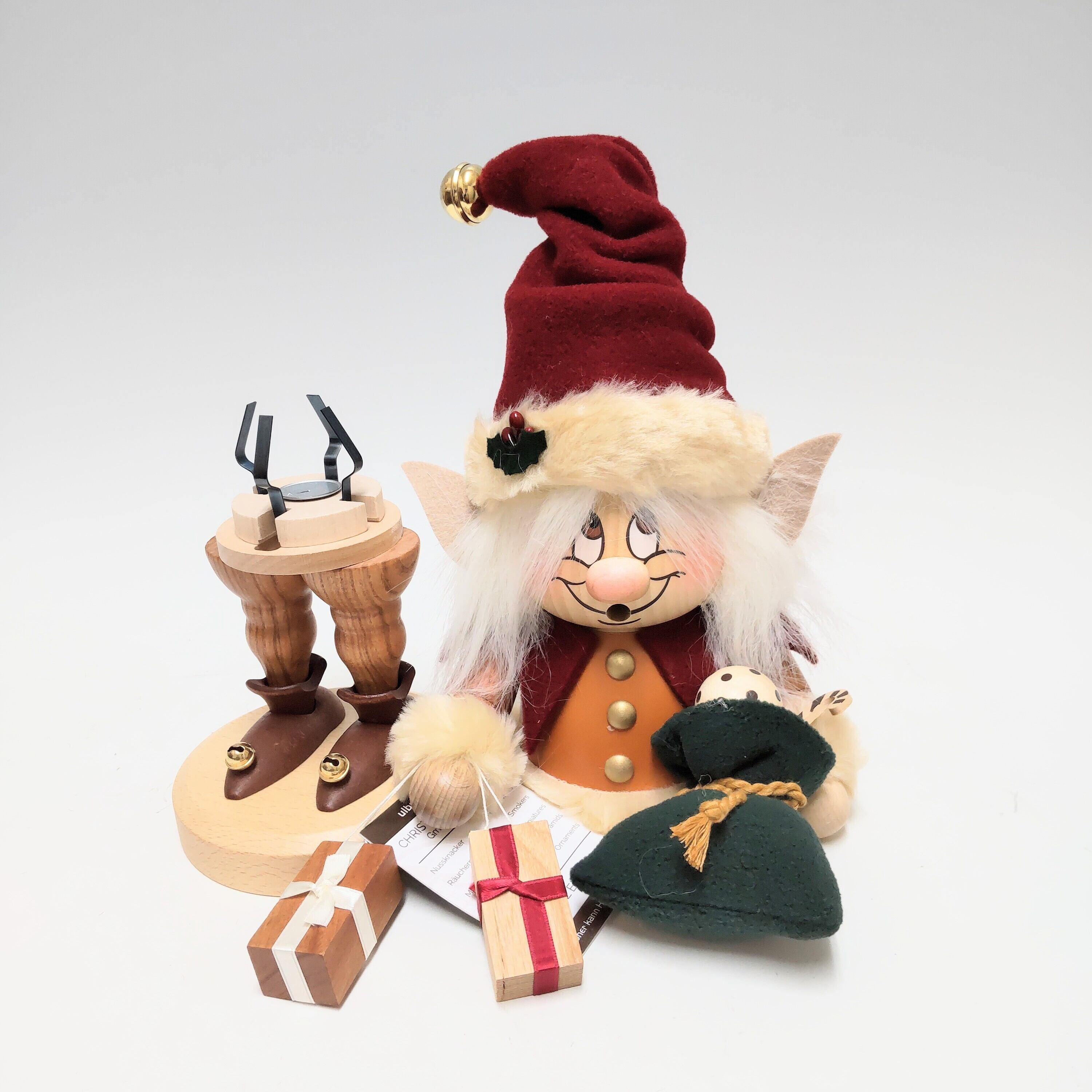 このお人形は香炉人形と言われ、胴体と脚の部分が二つに分かれ、脚の中にある金属の部分に香を載せ、火をつけて再び胴体を元通りにかぶせれば、口から煙がたなびき出ます。まるで人形が香炉のように見える大変ユニークな人形です。「小人の妖精」がモデルで、足元にも手にも子供の喜ぶプレゼントを持っています。可愛い帽子をかぶり、毎日どんなプレゼントをえらぼうかな?と考えているようです。可愛い耳がツンと立って、子供たちの願い事をいっぱい聞いているようですね。足先と帽子の先にはきれいな鈴がついていて、歩くたびに「チリン、チリン」と素敵な音が聞こえますよ。こんな小人さんが待っていてくれたら、お家へ帰るのが楽しみになりますよ。