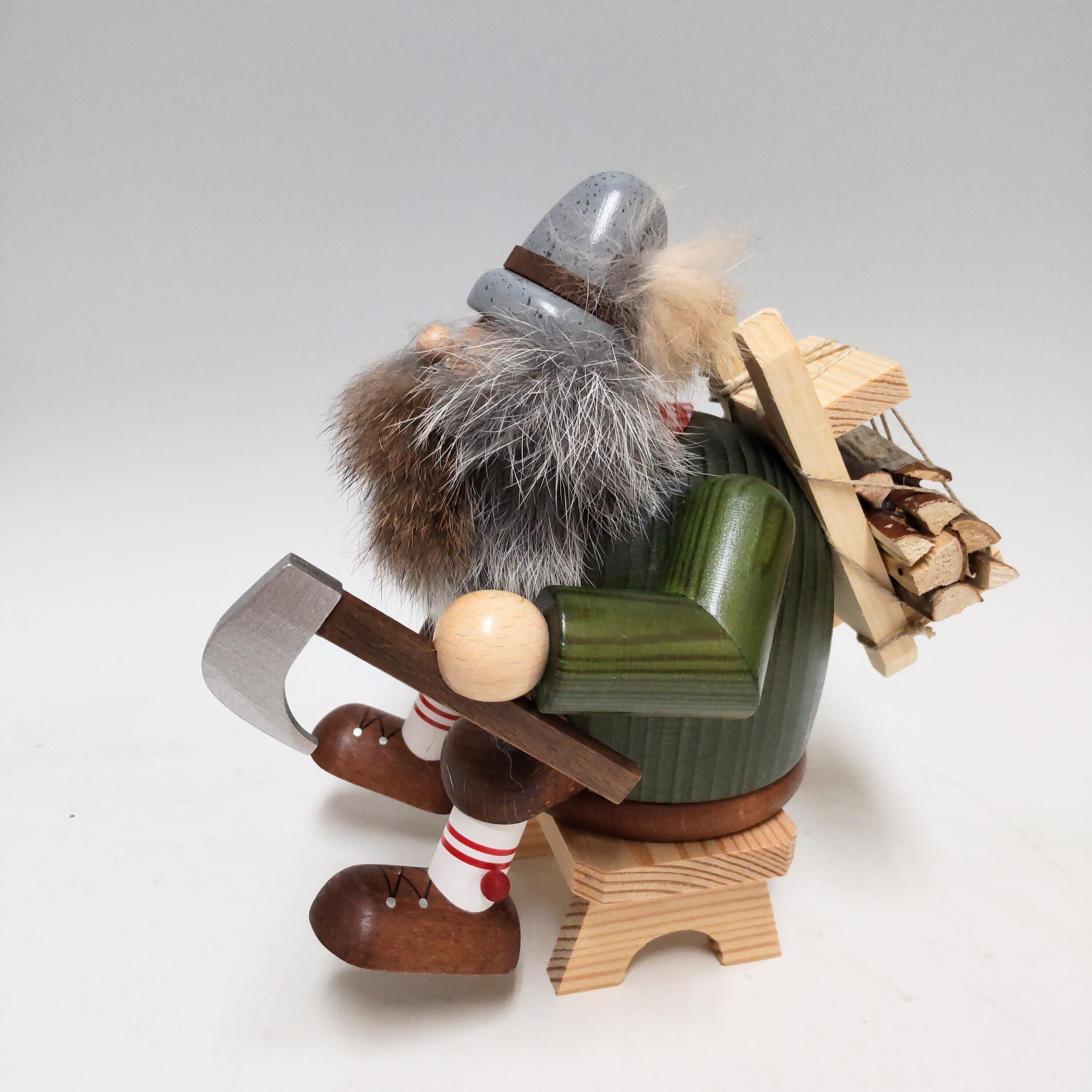 このお人形は香炉人形と言われ、胴体と脚の部分が二つに分かれ、脚の中にある金属の部分に香を載せ、火をつけて再び胴体を元通りにかぶせれば、口から煙がたなびき出ます。まるで人形が香炉のように見える大変ユニークな人形です。 穏やかで優しそうなまなざしのキコリさん。タップリフサフサのひげをたくわえ、ここらでちょっと一休みですね。片手には大きな斧を持ち、背中にはたくさんの木を担ぎ、一仕事が終わったようです。そろそろ家路につく頃でしょうか。のんびりとした様子がよく伝わる可愛いお人形です。こんなキコリさんと森の中で出会ったらきっと楽しいでしょうね。