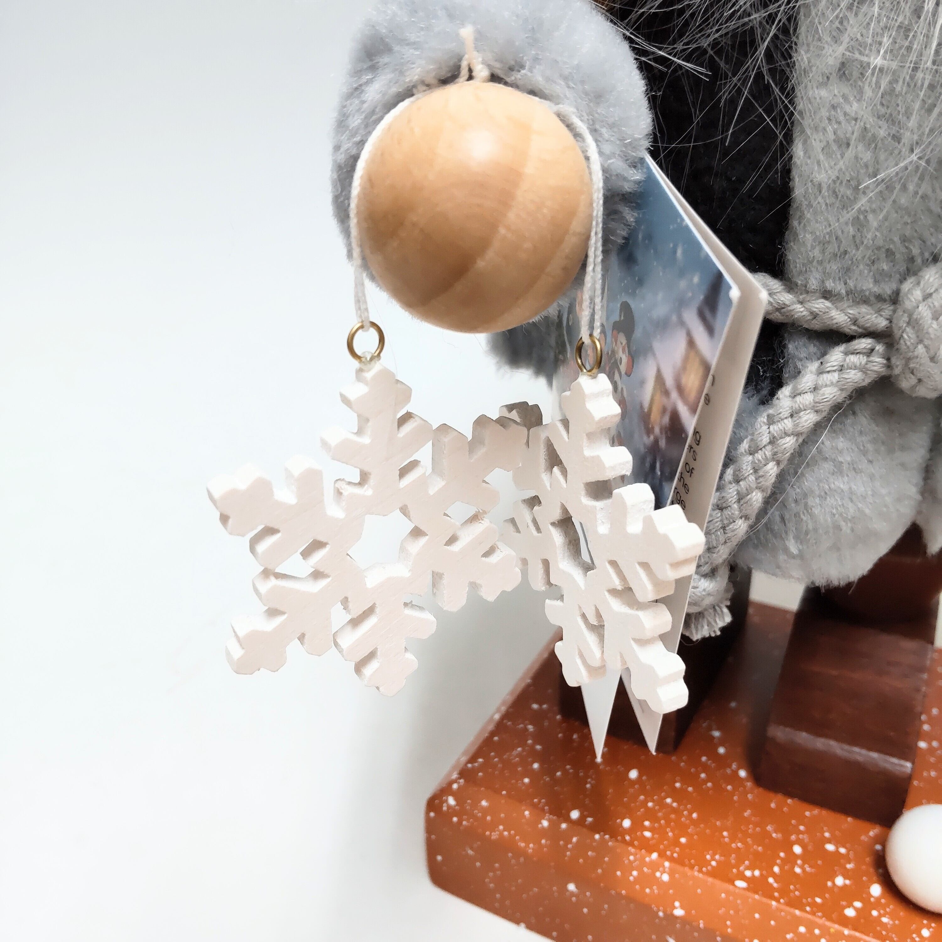 このお人形は香炉人形と言われ、胴体と脚の部分が二つに分かれ、脚の中にある金属の部分に香を載せ、火をつけて再び胴体を元通りにかぶせれば、口から煙がたなびき出ます。まるで人形が寒くて白い息を吐いているように見える大変ユニークな人形です。優しそうな表情のサンタさんが可愛いペンギンとお話し中です。