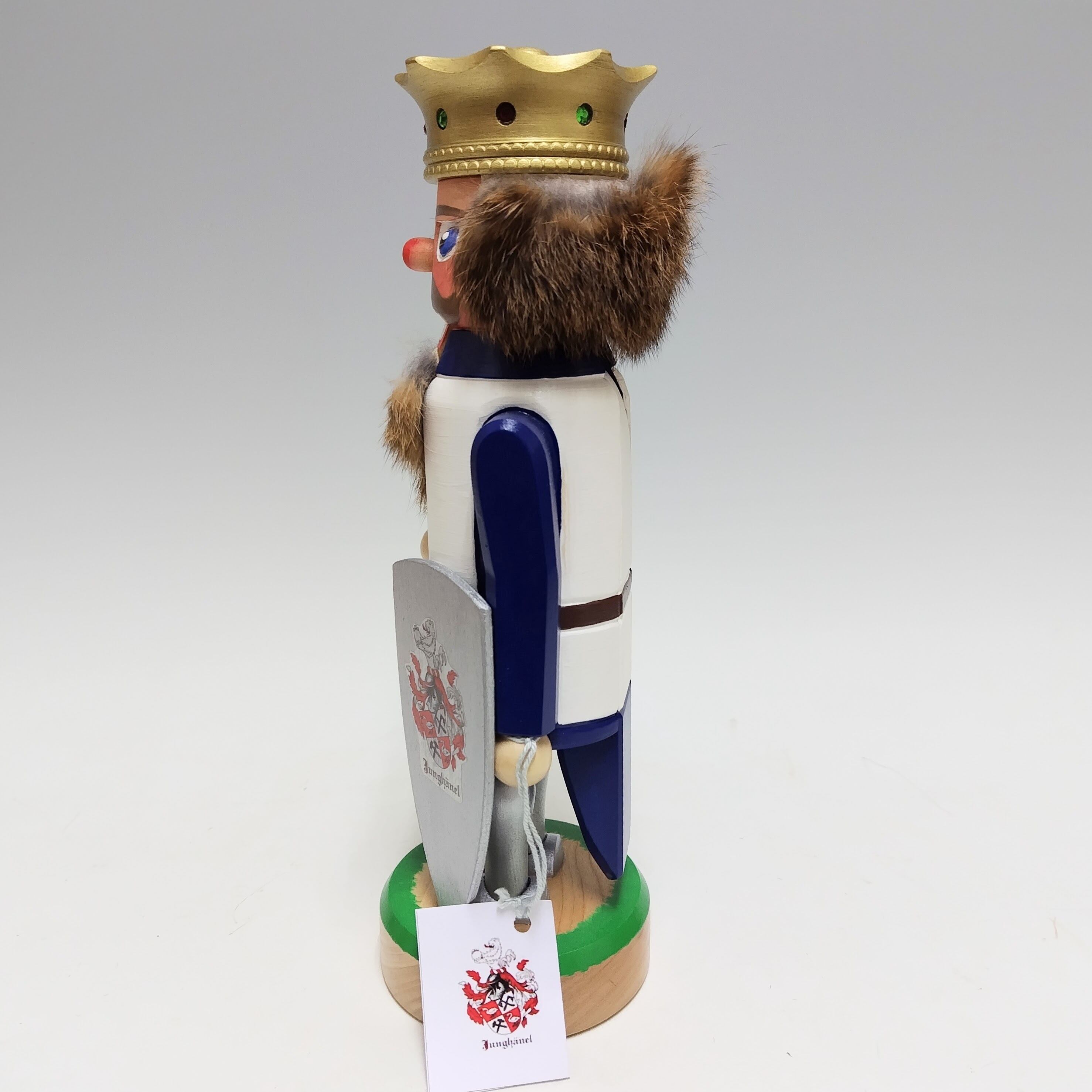 この『剣と盾を持つ王様 青』はユングヘネル工房のオリジナル作品です。ユングヘネル工房はツヴィッカウスタイルのくるみ割り人形制作で有名です。現在はお1人ですべての工程を制作しているので大量生産ができませんが、1体1体が魅力にあふれたくるみ割り人形です。